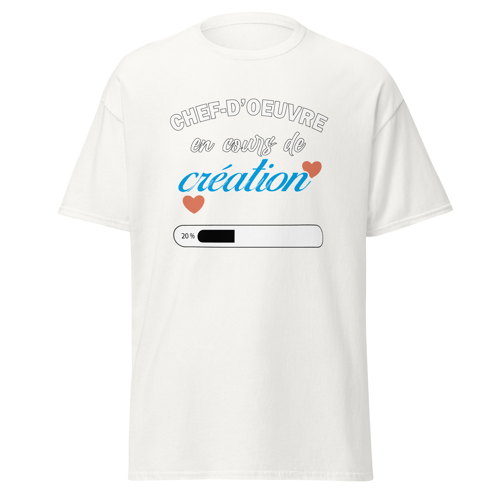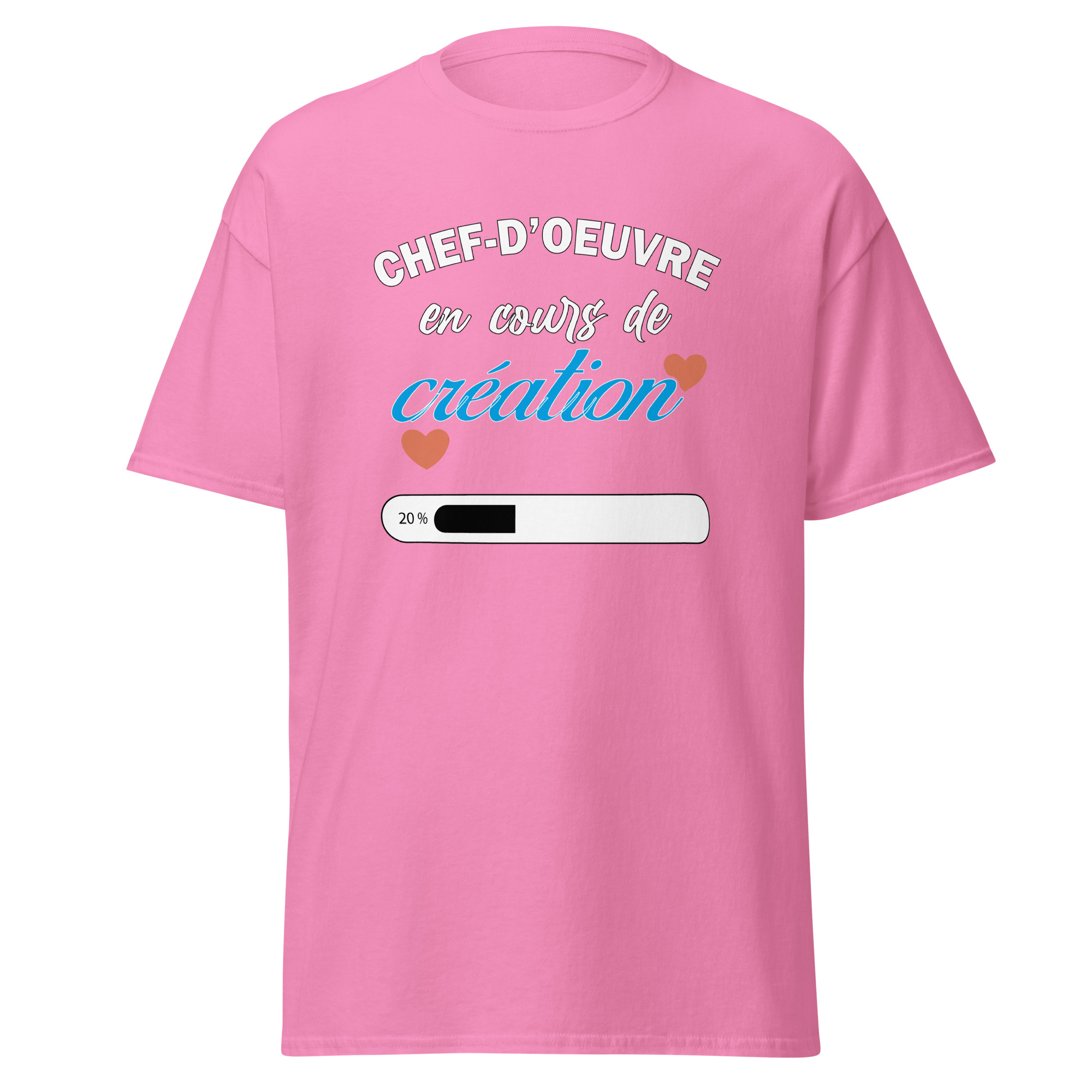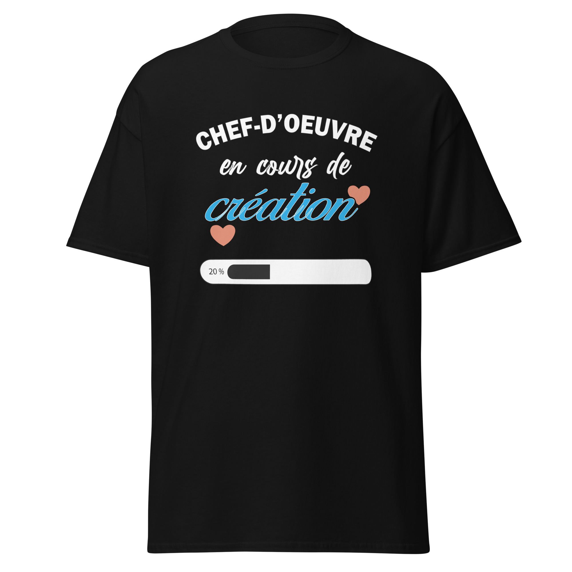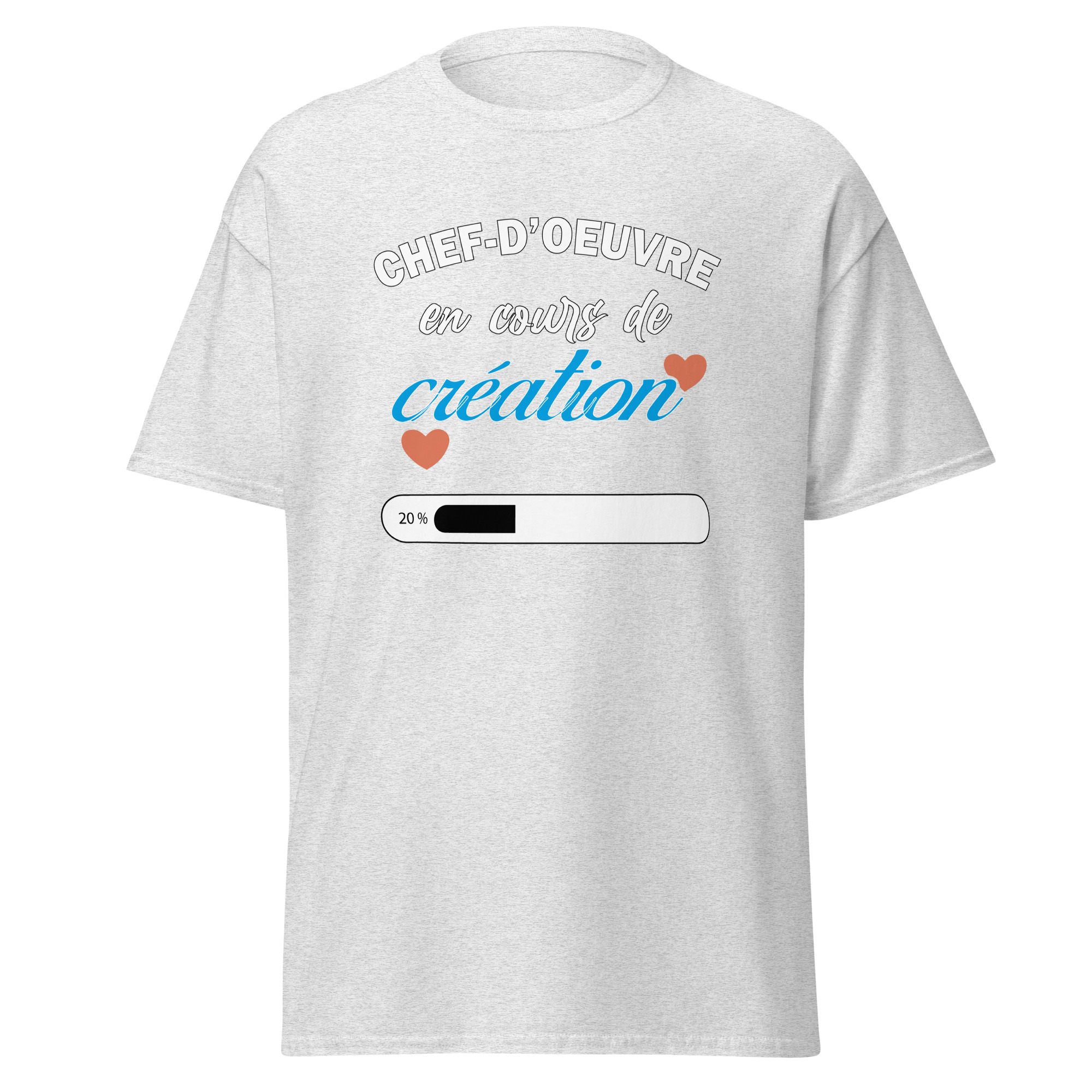 Annonce ta grossesse avec style et tendresse grâce à ce t-shirt unique ! Le message « Chef-d’œuvre en cours de création » révèle ton bonheur de manière créative, élégante et émouvante.