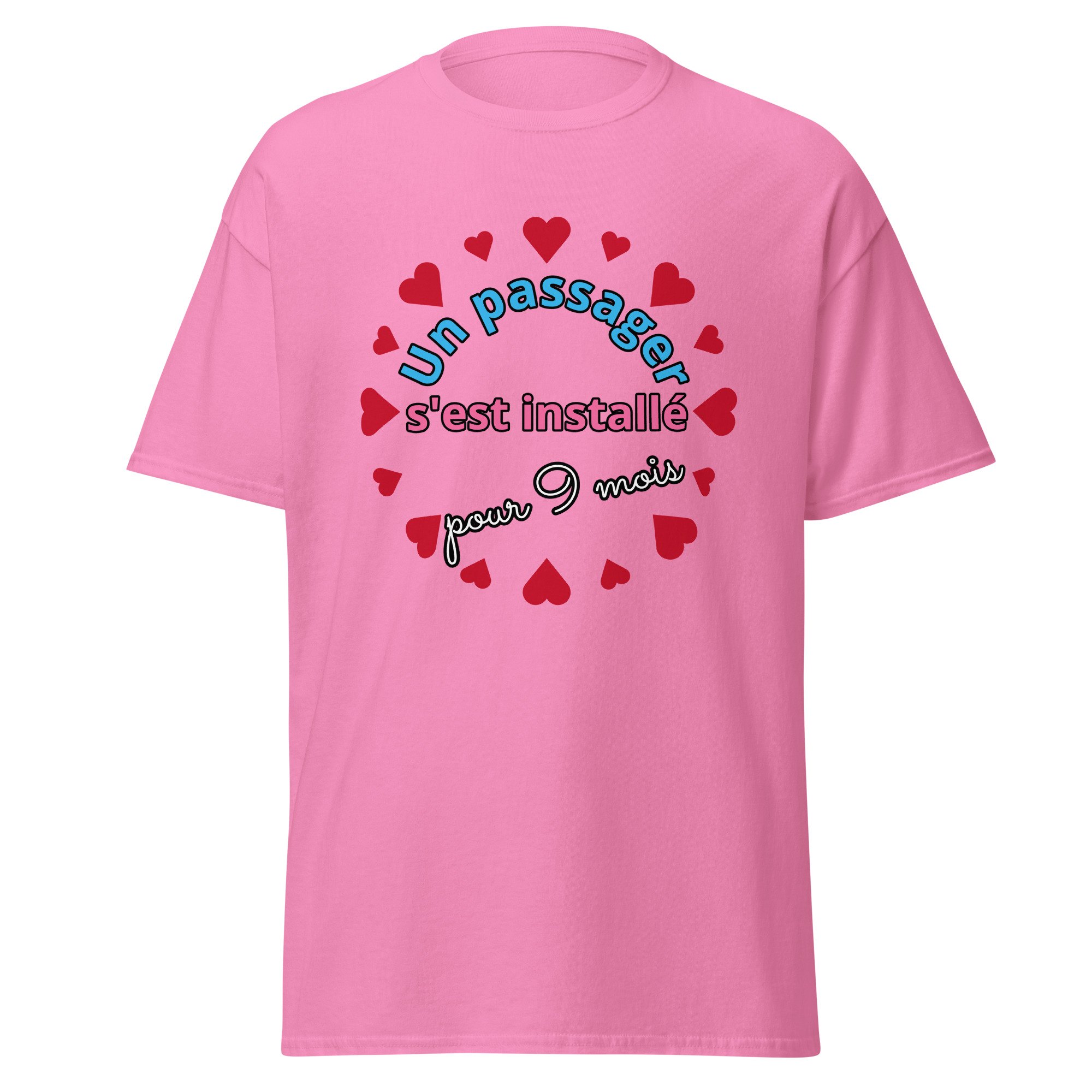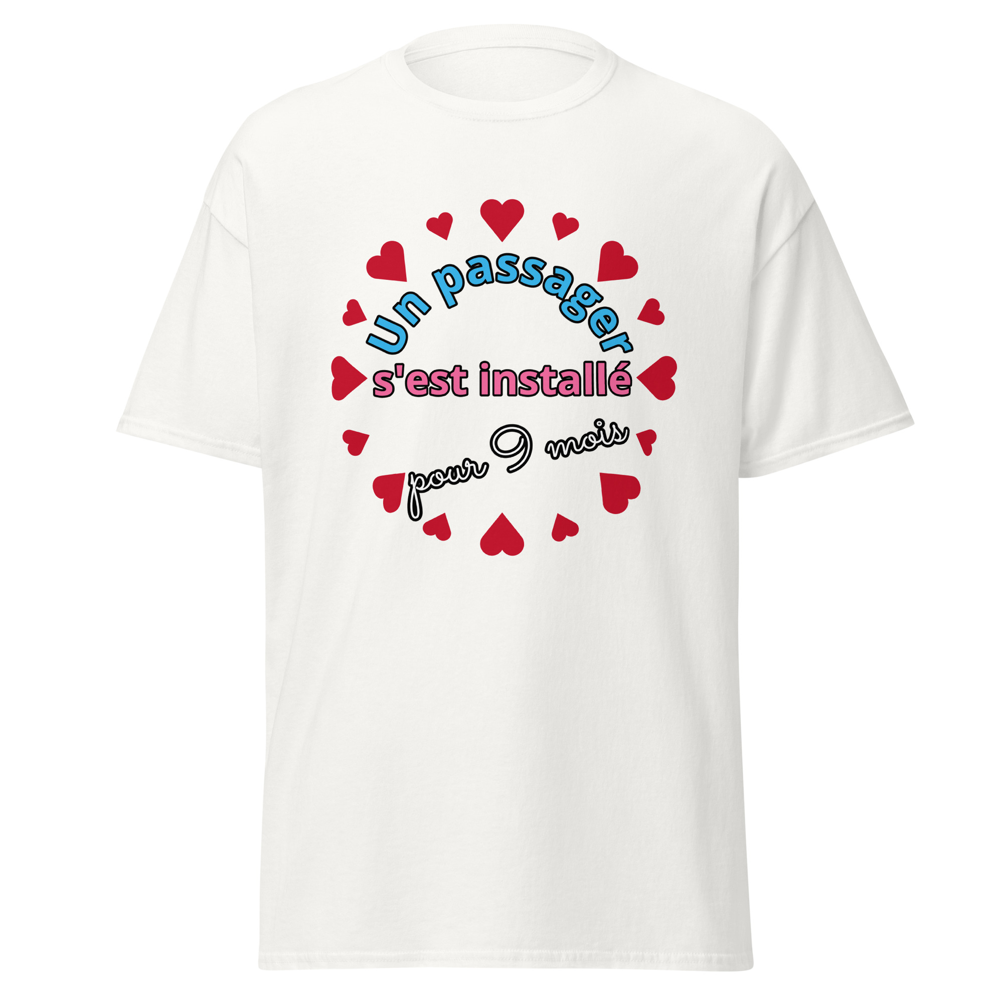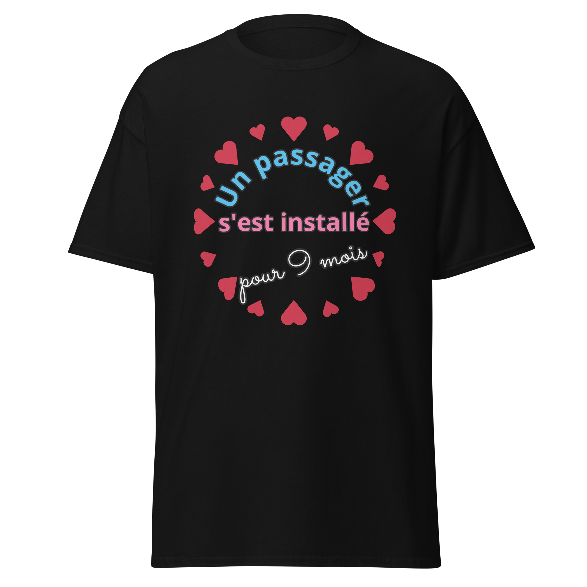 Découvre notre t-shirt exclusif, conçu pour révéler ta grossesse avec douceur. Le message « Un passager s’est installé pour 9 mois » s’affiche au centre d’un cercle de petits cœurs, symbole d’amour et de tendresse.