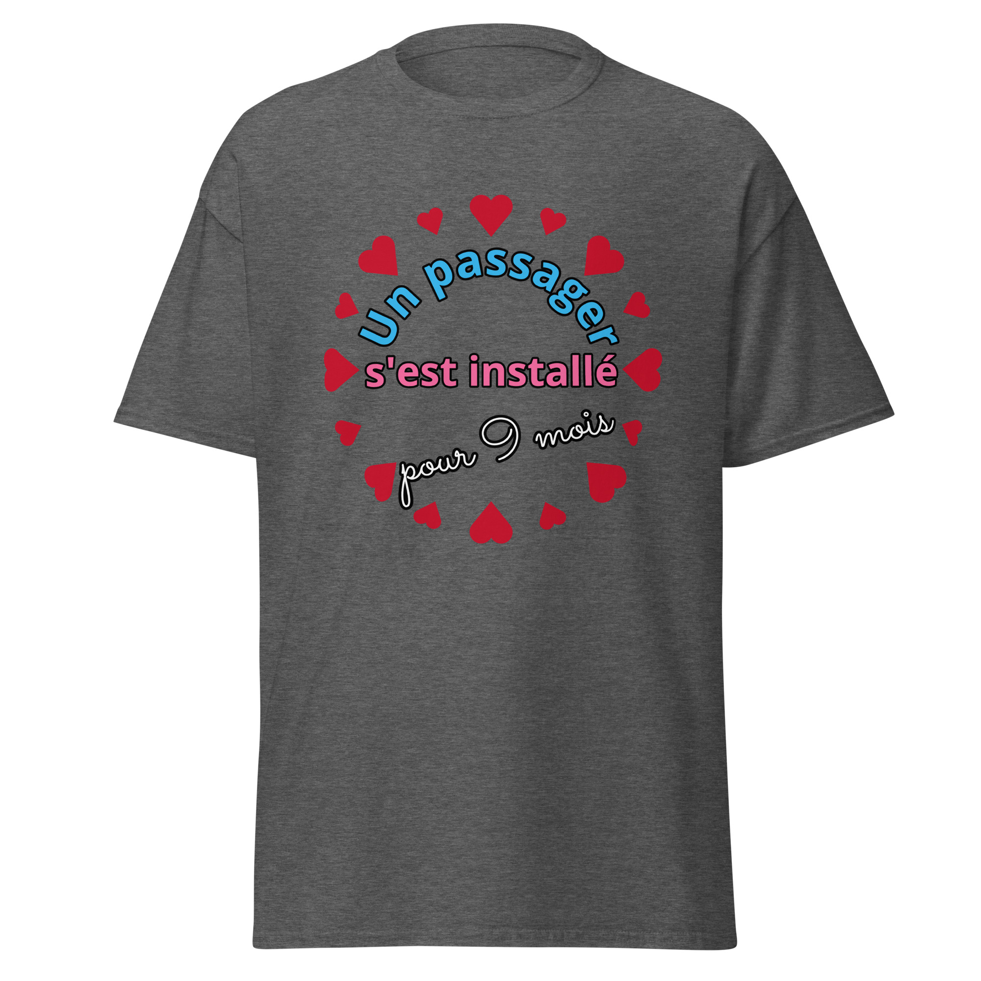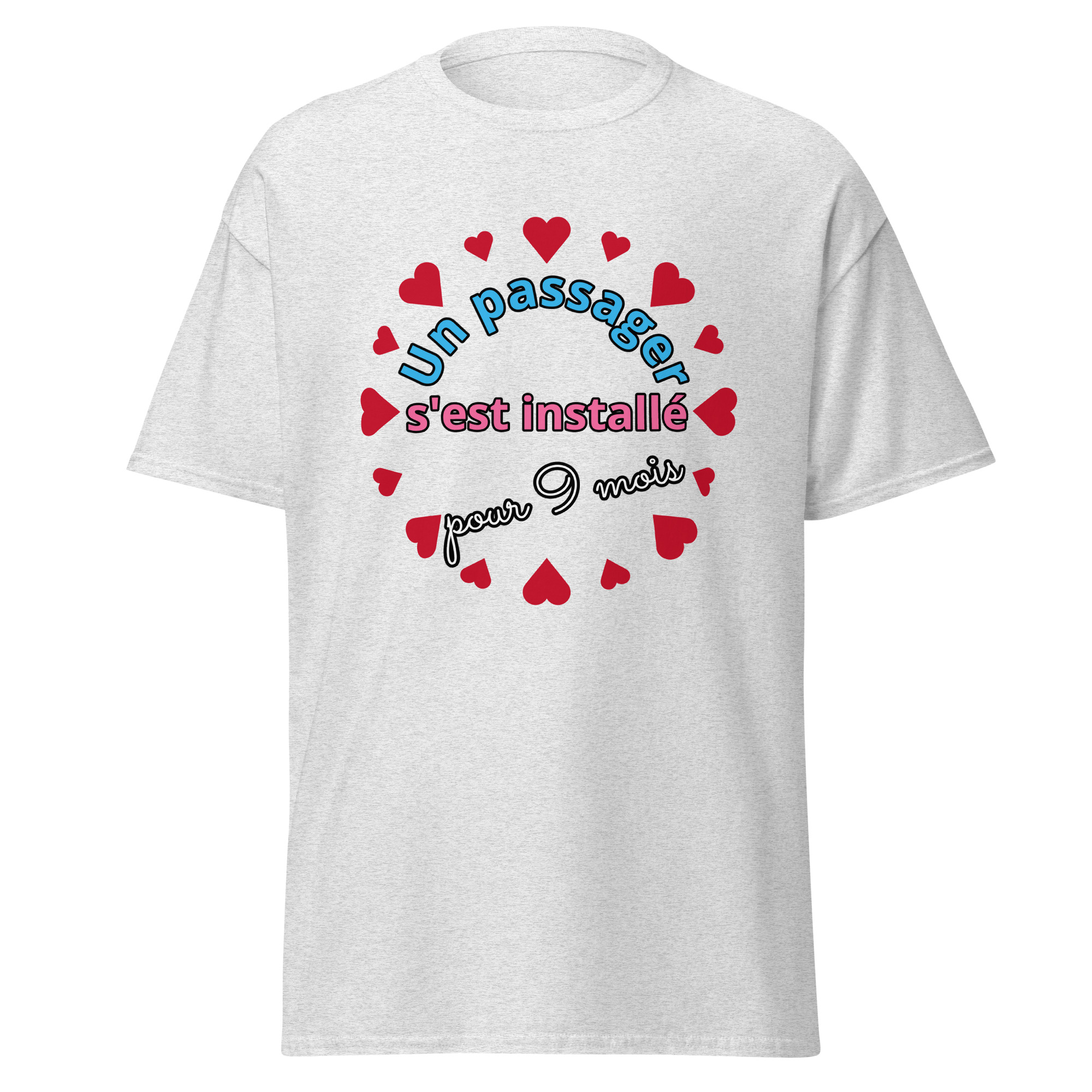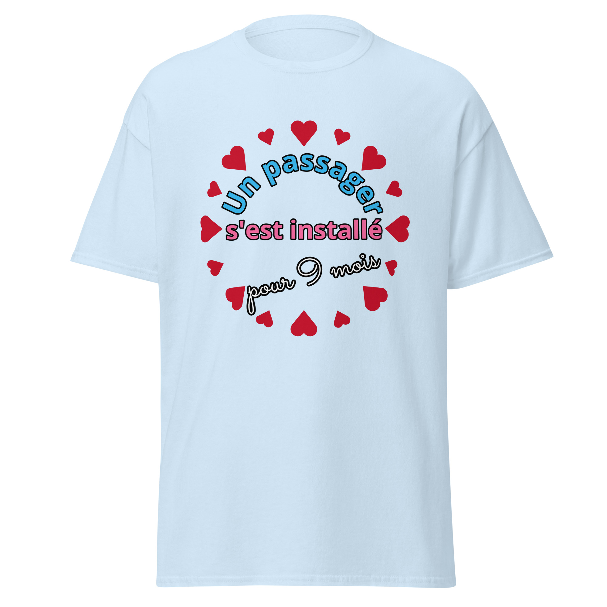 Découvre notre t-shirt exclusif, conçu pour révéler ta grossesse avec douceur. Le message « Un passager s’est installé pour 9 mois » s’affiche au centre d’un cercle de petits cœurs, symbole d’amour et de tendresse.