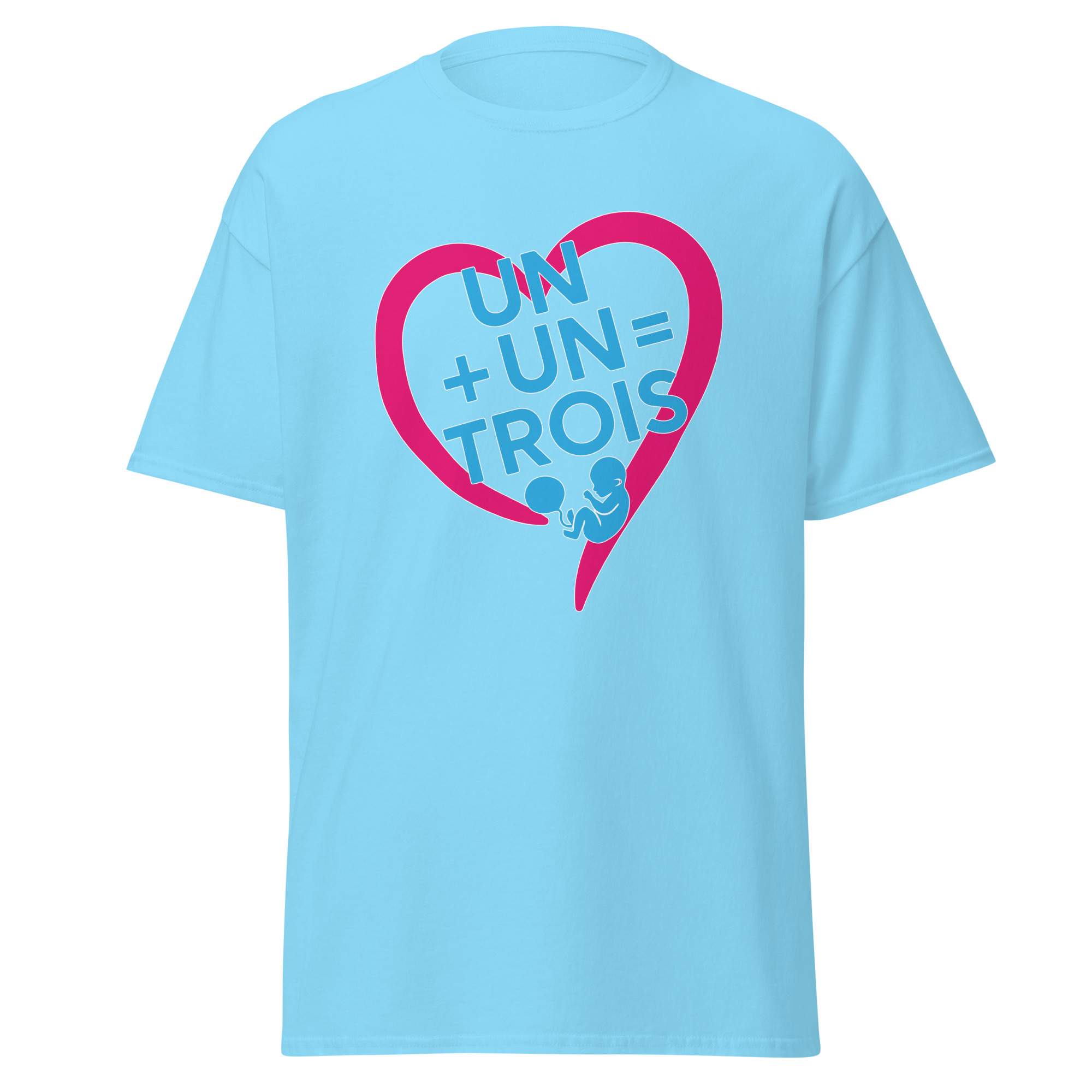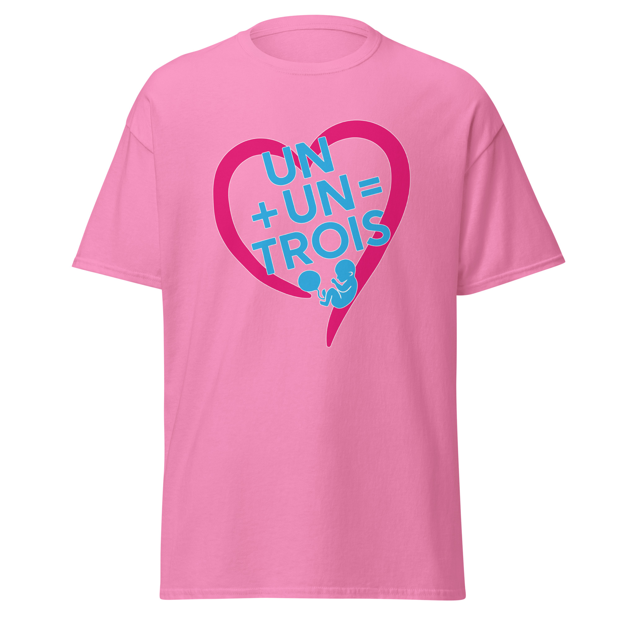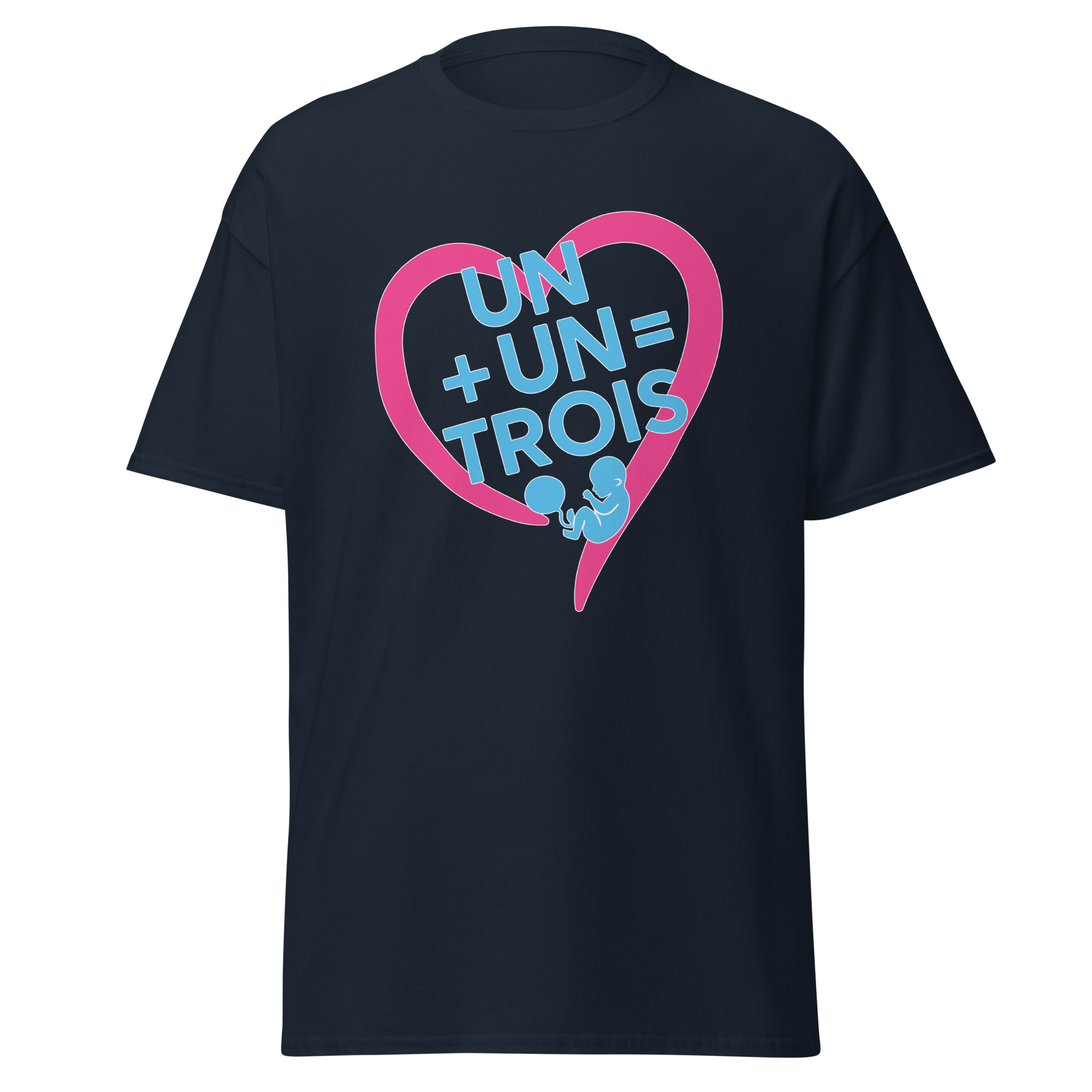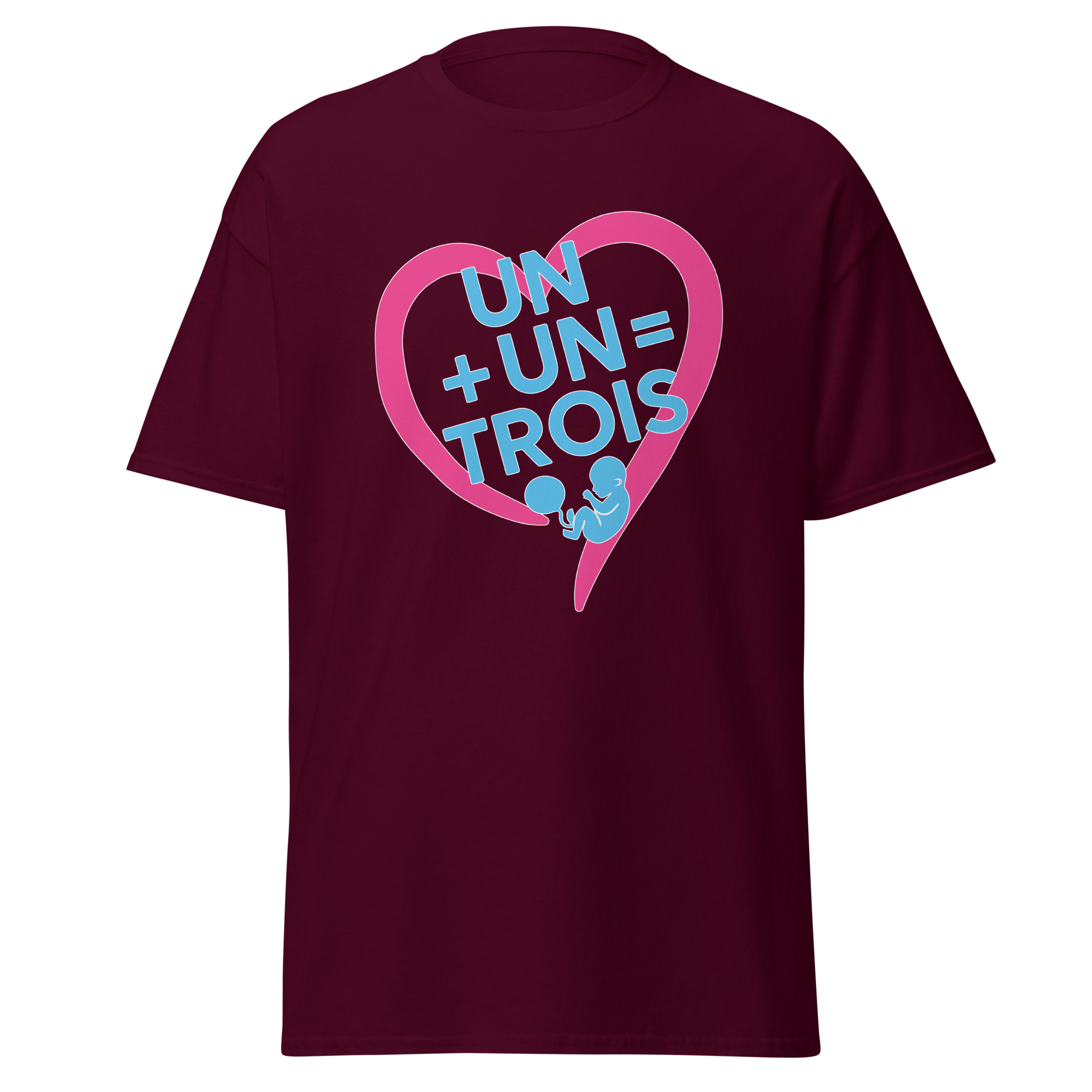 Exprime ton bonheur avec ce t-shirt unique, parfait pour annoncer ta grossesse de manière originale. Le message « Un + Un = Trois » s’affiche en grand au centre d’un cœur, pour une révélation tendre et symbolique.