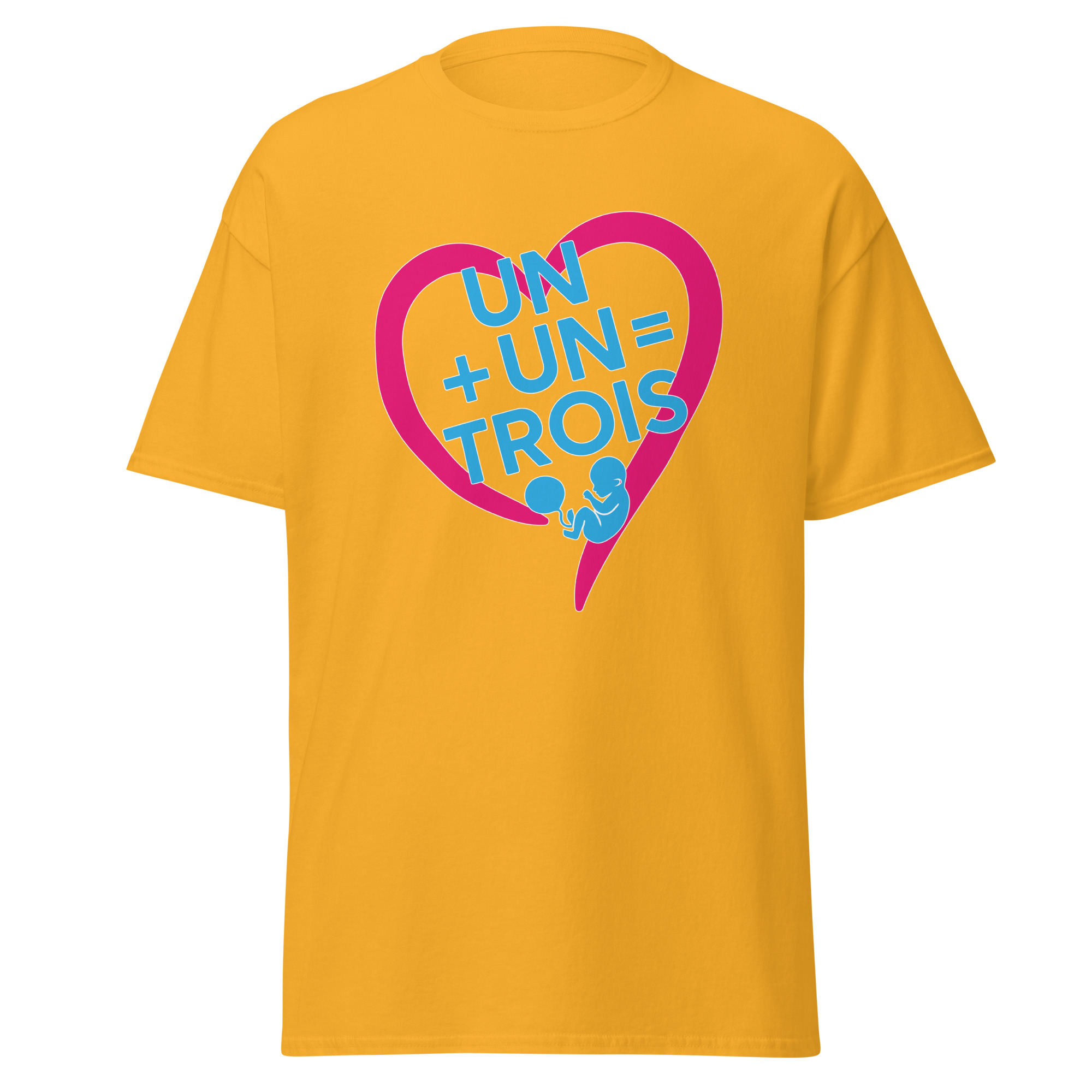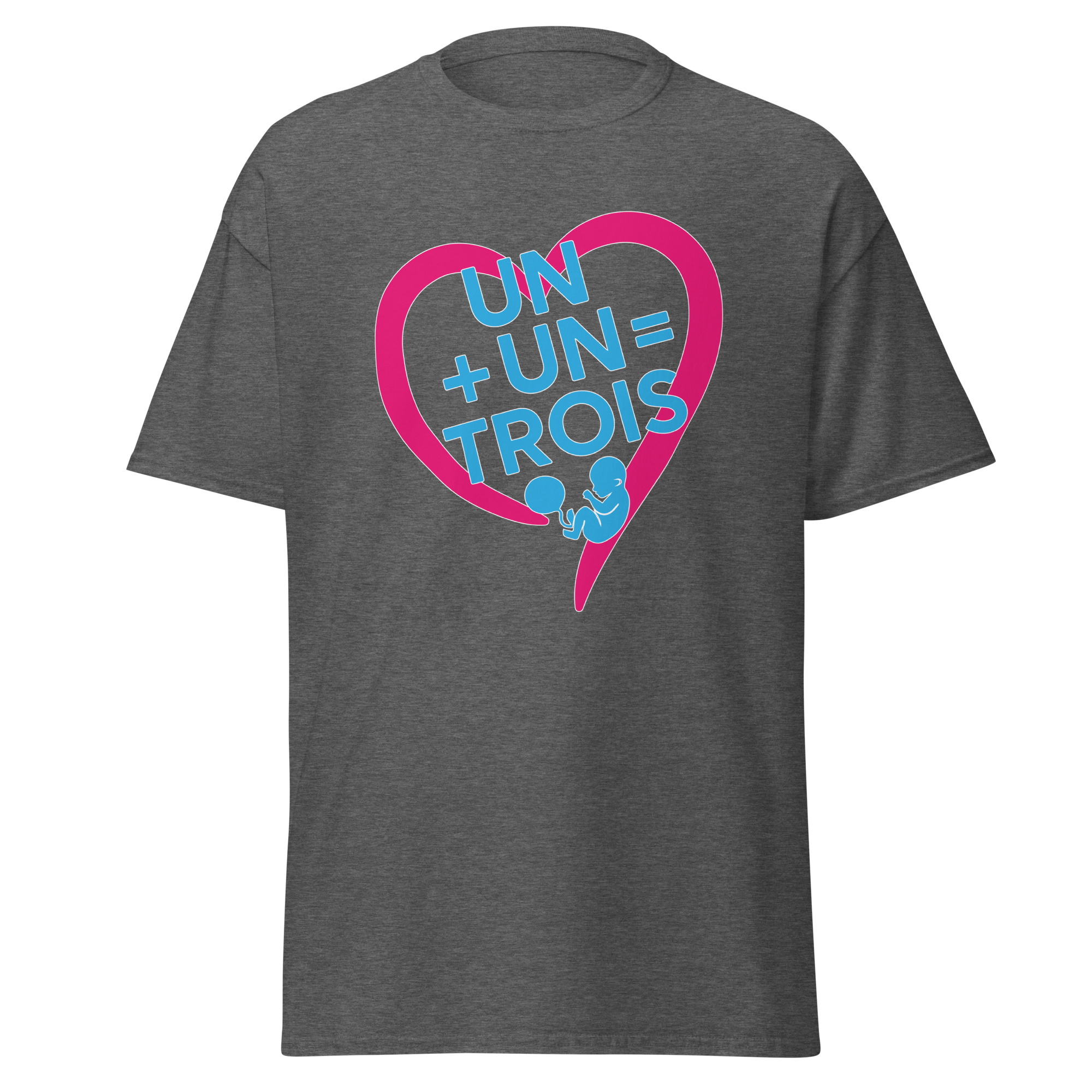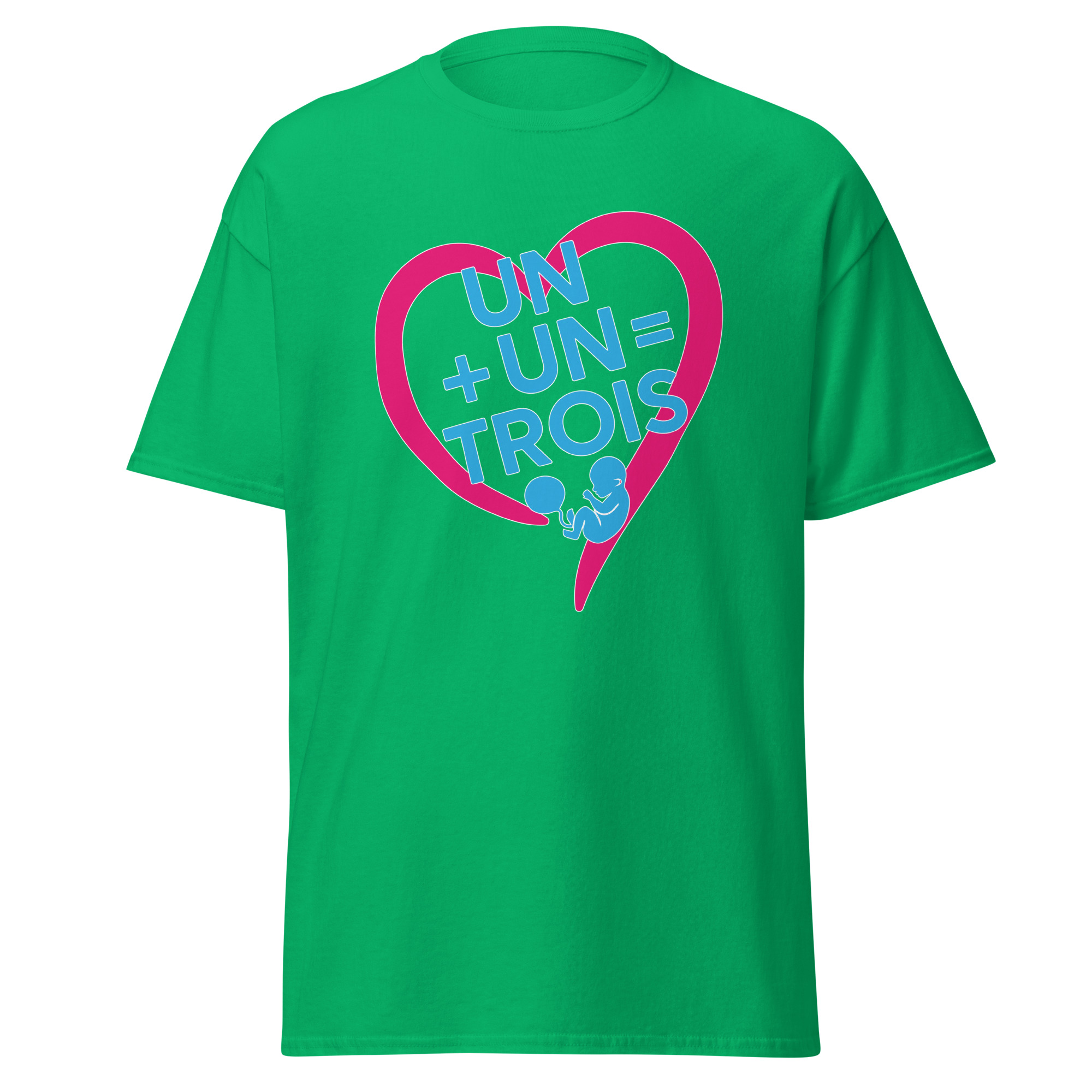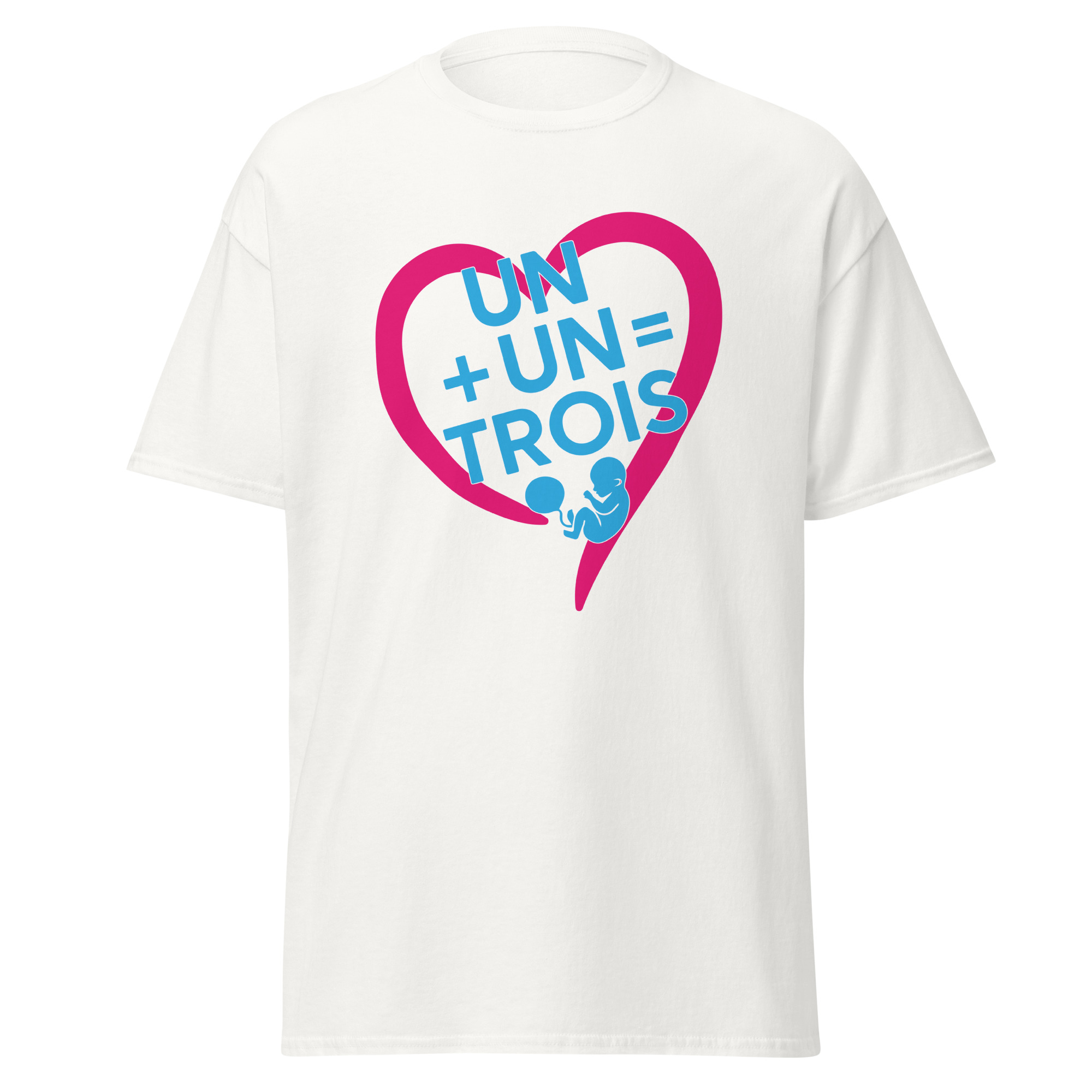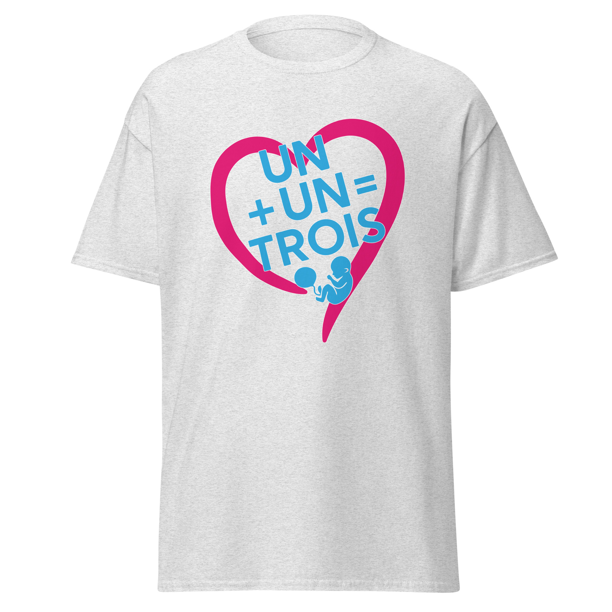 Exprime ton bonheur avec ce t-shirt unique, parfait pour annoncer ta grossesse de manière originale. Le message « Un + Un = Trois » s’affiche en grand au centre d’un cœur, pour une révélation tendre et symbolique.